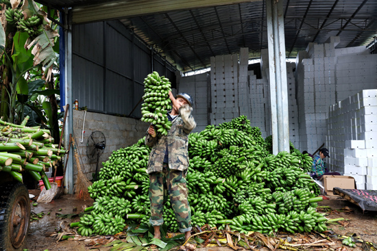 早晨6点多,天刚刚放亮,广西南宁金陵镇的东盟农贸城里已经停满了红色的三轮电动车,附近的村民们正排队将刚刚割下来的青色小米蕉,送往分拣、包装的集散处。在长超过100米、宽近40米的农贸城主道上,叠满了整整齐齐的快递箱,三辆9.6米的货车停靠在农贸城大门外,等待着将小米蕉送往全国各地。