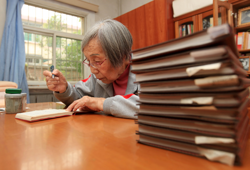 1990年11月韩凝离休,随丈夫(副军职老干部)来到干休所。在韩凝的家中,有三个大书橱,里面不仅有书籍还有30多本学习笔记。最近,韩凝在学习《习近平谈治国理政》第三卷,上面用红笔仔细做了标记。