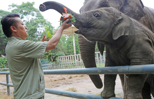 昨天,济南动物园的工作人员为小象“亚齐”庆贺一周岁生日 记者 赵天羿 通讯员 郭玲 摄