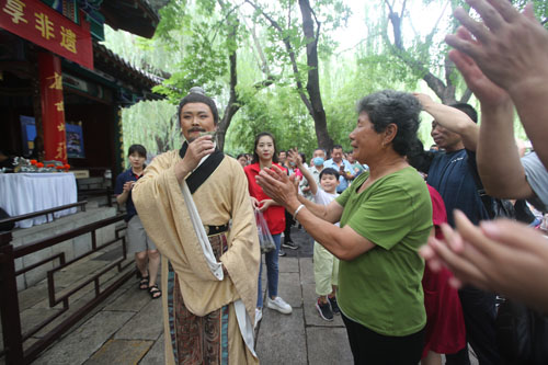 现场演员们身着“孙悟空”和“屈原”服饰,为市民送上粽子和祝福 记者 赵天羿 摄
