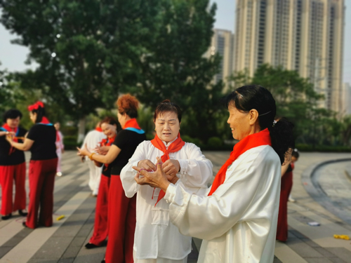 “原地踏步走,一二一、一二一……”60岁的赵萍喊着口号,老人们排成整齐的队伍。“我们是共产主义接班人,继承革命先辈的光荣传统,爱祖国、爱人民,鲜艳的红领巾飘扬在前胸……”老人们齐声合唱《我们是共产主义接班人》后,互相佩戴红领巾。
