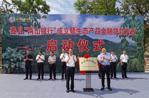 临沂市副市长郑连胜(前左一)、费县县委书记赵庆文(前右一)为费县“两山银行”揭牌