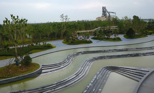 公园东南侧保留的济钢工业建筑3200高炉高高耸立