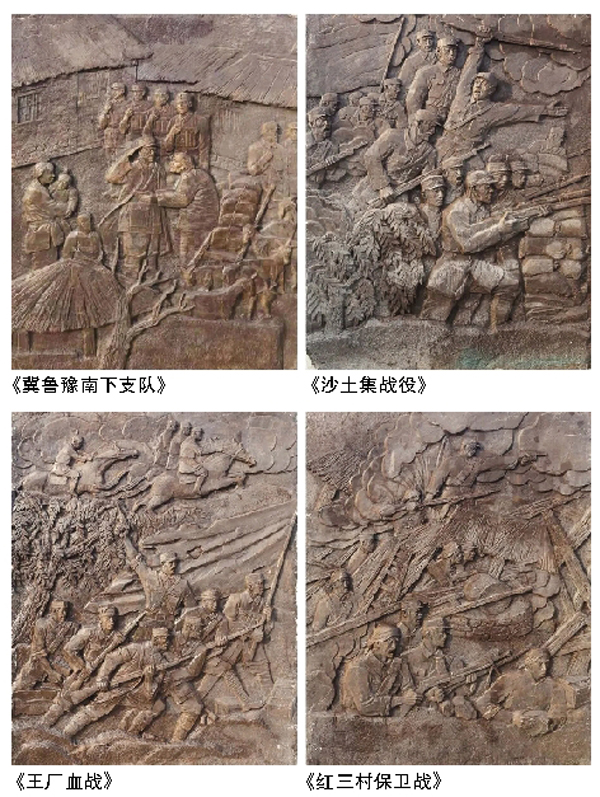 《沙土集战役》浮雕作品所呈现的内容历史意义深远,它宣告了国民党军队对山东重点进攻的破产;《红三村保卫战》画面展现了男女老少,人人皆兵,奋起抵抗,多次打败国民党顽固派进攻,是军民团结战斗夺取胜利的典型;《潘溪渡伏击战》描绘了八路军歼灭日军的雄壮威武,是八路军在鲁西南平原创造的一个歼灭日伪军的模范战例;《王厂血战》刻画了鲁西南抗日将士与日军浴血奋战的场面,此役留下了英勇悲壮的一页,他们的浩然正气,惊天地泣鬼神;《解放菏泽城》镌刻的是八路军战士顶着硝烟,冒着枪林弹雨,在菏泽城内展开激烈巷战;《定陶战役》再现了解放军战士前仆后继,英勇奋战的感人画面,这场战役对整个解放区南部战线起了扭转局面的重要作用;《鲁西南战役》铭记的是人民解放军战略进攻的场景,这场战役揭开了中国人民解放军战略进攻的序幕;《冀鲁豫南下支队》浮雕呈现的是南下西进支队优秀儿女,接管贵州省,为中国人民的解放事业做出重大贡献的场景。