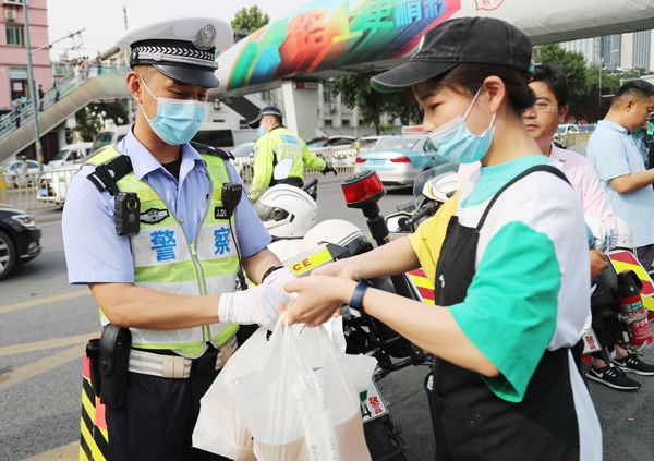 当天在下午考试开考前,六里山南路英雄山路交叉口正在疏导交通的民警也收到了一份外卖消暑饮料,外卖订单上写着“高考不易,交警守护。保驾护航,不惧酷暑!警察叔叔辛苦了!天气炎热,注意防暑!”市民的暖心举动,为烈日下的民警们带来了一丝清凉。