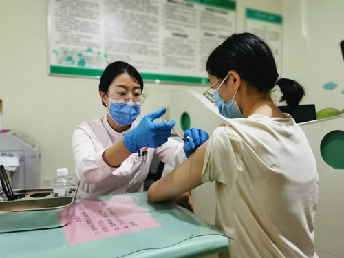 一名高中毕业生正在进行新冠疫苗第一剂次接种