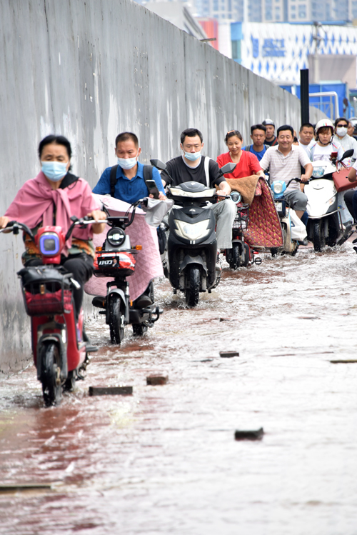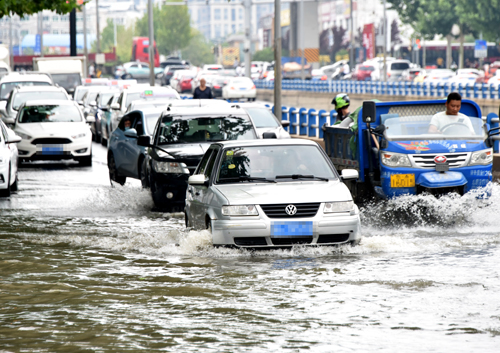 经过一夜的暴雨,路上行驶的车辆犹如过河 记者 周里 实习生 郇志同 摄