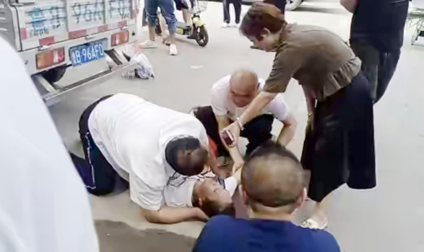 青岛的哥陈廷民正在抢救休克女子(视频截图)