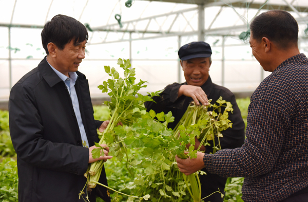 潍坊市寒亭区前阙庄村党支部书记于英智在大棚内和村民交谈 (受访者单位供图)