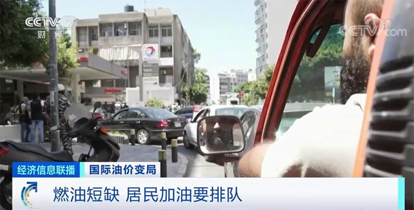 近日,在黎巴嫩贝鲁特的一处加油站,各式各样的汽车和摩托车排起了长队(央视界面截图)