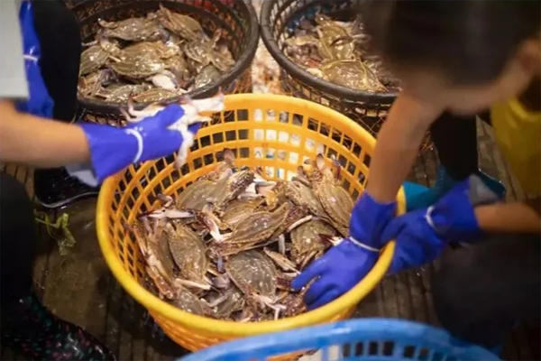 8月初,舟山港万船齐发出海捕蟹,一筐筐梭子蟹上岸,为确保梭子蟹鲜活,工作人员对捕获上岸的梭子蟹进行第一轮分拣,淘汰掉空壳蟹、断脚蟹以及活力差的蟹,并按蟹的大小分成不同规格。