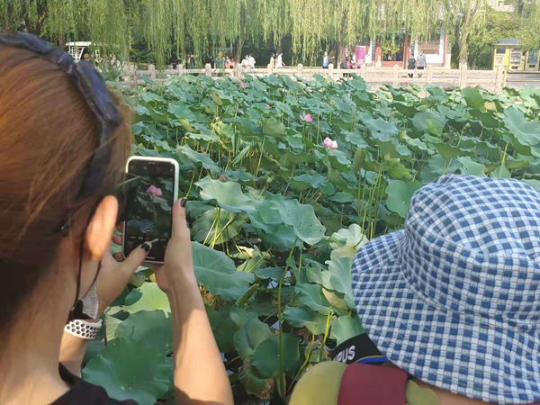 大明湖内的并蒂莲引得游客纷纷拍照留念