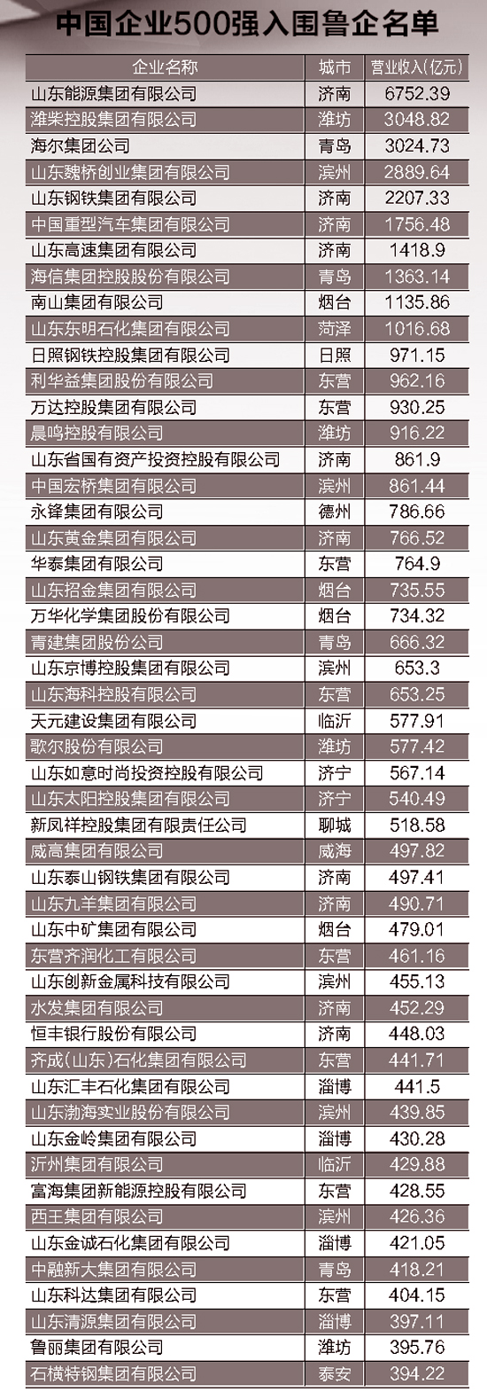 数据显示,本次入围500强的50家鲁企,营业收入总值为47909.64亿元,同比去年增长12.45%;平均收入为958.19亿元,同比增长5.7%。而泰安企业石横特钢集团则充当了50家入围鲁企“门槛”的角色,它以394.22亿元的营收排名500强榜单第498位。