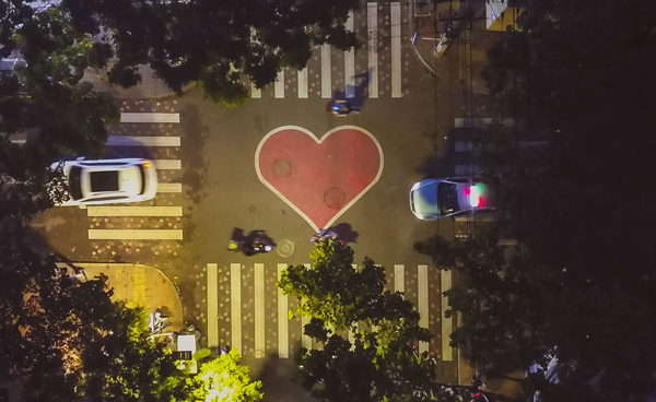 空中俯瞰经三路十字路口中间大大的爱心
