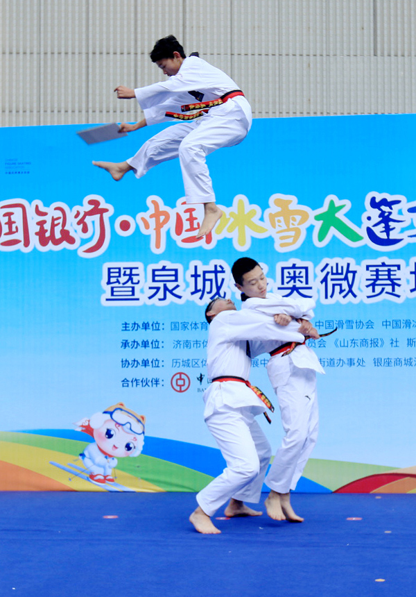 开幕式上,由历城区跆拳道协会带来的综训竞演节目在寒冷的冬日点燃了现场观众的热情,引得市民纷纷驻足围观,活力十足的表演打破了寒冷冬日的桎梏,让现场活跃了起来;历城区跳绳协会教练员们带来了精彩纷呈的花样跳绳表演,随着律动的音乐跳绳翻舞不停,花样百出的表演引得现场阵阵掌声;压轴节目是由历下百合幼教集团带来的《童趣迎冬奥》节目,小朋友们身穿太空服,在各种道具的辅助下,用身体摆出了冬奥会各个项目的简易图示,萌翻了全场观众,同时也让冬奥项目生动形象地印刻在大家的脑海中。