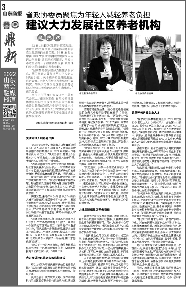 “我后来打听到,小区里10月份正在装修的房舍将用于失能和半失能老人的护理,建好后,要是老人需要的话,会很大程度减轻我们的养老负担。”张先生说,对于委员提出的大力建设社区养老服务机构及社区医疗服务机构的建议,他举双手赞成。