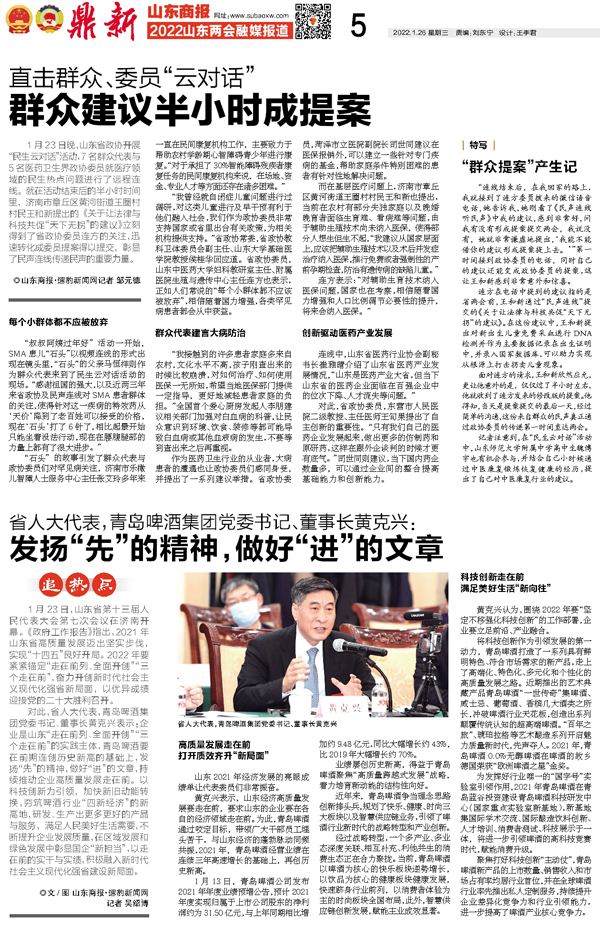 1月23日晚,山东省政协开展“民生云对话”活动,7名群众代表与5名医药卫生界政协委员就医疗领域的民生热点问题进行了远程连线。就在活动结束后的半小时时间里,济南市章丘区黄河街道王圈村村民王和新提出的《关于让法律与科技共促“天下无拐”的建议》立刻得到了省政协委员连方的关注,迅速转化成委员提案得以提交,彰显了民声连线传递民声的重要力量。