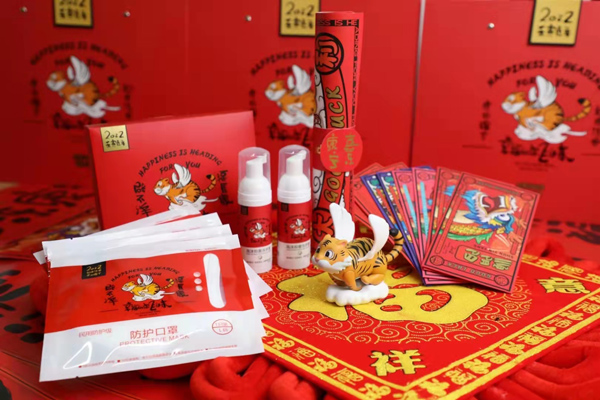 在常态化疫情防控的当下,大众早已养成了自觉消毒、佩戴口罩的好习惯,考虑到这一点,青年文创专家、国家文化与旅游部双创人才库成员谷旭亮携手阳普医疗推出了壬寅虎年新春福康大礼包,其中包括春联、福字贴、门神、红包、健康防护文创口罩与便携抑菌洗手液以及一款可爱俏皮的飞虎公仔摆件。既涵盖吉祥传统文化、国潮文创设计,又包含高品质健康防护装备,满足了人们平安健康过年的需求。