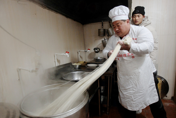 印象里,他要和师傅去赶大集卖面,凌晨三四点就要起床做准备,但他只能打打下手,挑水刷碗,“师傅摔面我就在一旁看着。”时间久了,自然而然地接触的也就多了。他和老师学了几年,后来去了其他店铺做“摔面师傅”,终于在2012年,他有了属于自己的第一家面馆。他知道,这样的生活离不开当年的学徒经历。