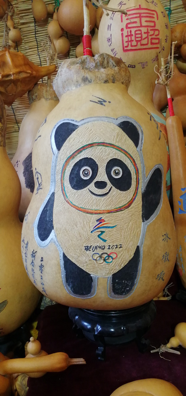 桌子中央的大葫芦,是谭小村近来专门创作的葫芦雕刻版冰墩墩。谭小村告诉山东商报·速豹新闻网记者,“葫芦是去年在学校种的,品种叫‘莲花头’,形似冰墩墩,所以创作这件作品为冬奥会献礼。”
