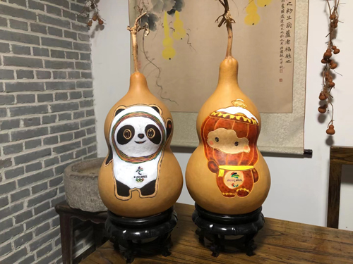 当寓意美好的葫芦邂逅吉祥物,造型搭配的同时也可见马友谊葫芦雕刻技艺的功力。“此次雕刻吉祥物冰墩墩和雪容融的葫芦经过特别挑选,选择的都是5年以上的葫芦,且形态上呈现出粗腰胖胖的状态,与吉祥物的形象比较搭配。在雕刻技法上采用的是章丘传统葫芦雕刻技艺中的彩刻工艺,用非遗技艺助力冬奥会。”马友谊介绍。