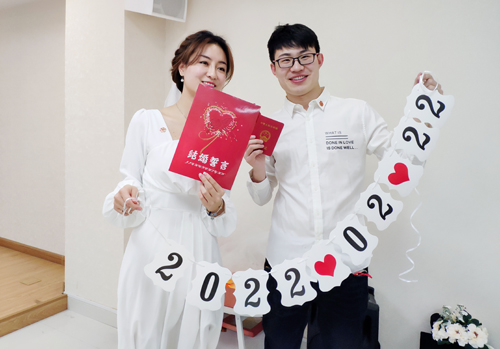 昨天是“世纪有爱日”!新人赵爽说,数字2的谐音为“爱”,数字0的谐音为“你”,2022的谐音就是“爱你爱爱”,“在这个有爱的日子,我们要完成人生大事——领证结婚。”