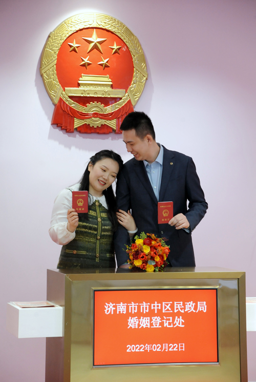 “今天(2月22日)是2022年2月22日,星期二,农历正月二十二,有9个‘2’,寓意着爱意长长久久。”新人朱伟告诉山东商报·速豹新闻网记者,他跟妻子魏薇早上七点就到达了婚姻登记处,早早地就拿到了属于他们的结婚证,“我们早就商量好了领完证,一起去吃我们婚后的第一顿早餐,然后一起上班。”
