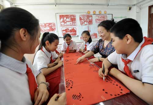 济南市趵突泉小学美术老师孙秀芹为学生教授剪纸(资料图)