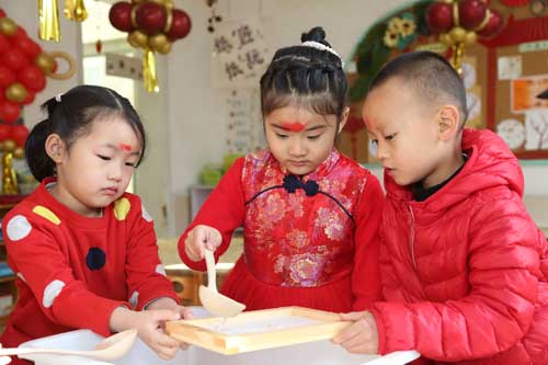 幼儿园里的非遗传承是将非遗文化融入到幼儿园的游戏活动、主题活动中,在游戏中体验,在活动中探索,在幼儿心中播下“非遗”保护的种子,让中华文化精神深深根植于孩子的心中。
