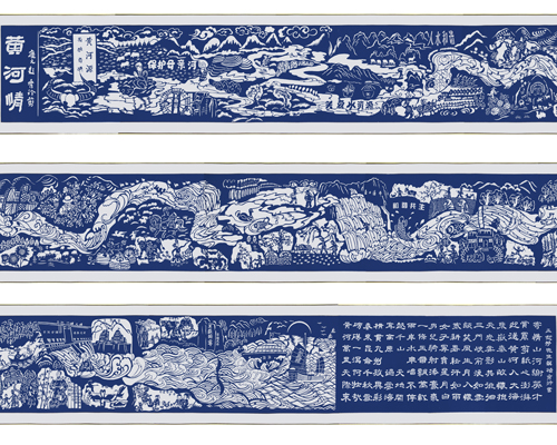 杨秀玲以剪纸长卷形式,用传统的剪纸元素及阴阳结合技法剪制描绘出沿黄九省区的黄河文化和地域景观。比如,四川的黄河九道湾、甘肃的大水车、宁夏的丝绸之路驼队、内蒙古的蒙古包和能歌善舞的牧民、陕西窑洞里剪纸的老人和孩子、山西的壶口瀑布、河南的三门峡大坝、山东的“一山一水一圣人”等等。作者将剪纸、诗词融为一体,是一幅弘扬中华民族百折不挠顽强精神,唤醒人们保护黄河流域生态和高质量发展,体现中华优秀传统文化创造性转化、创新性发展的优秀作品。