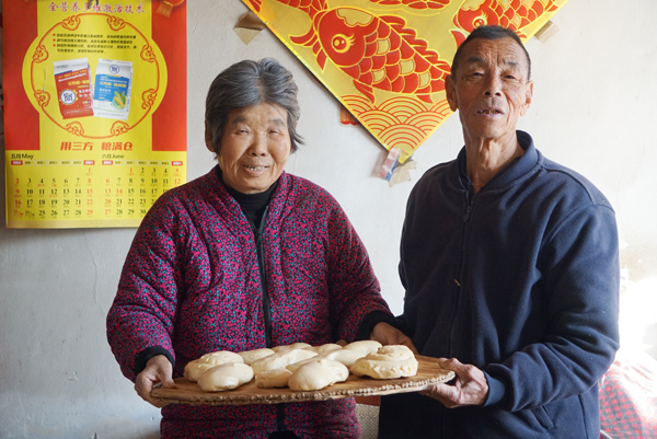 刘臧氏和老伴儿向记者展示他们制作的花馒头