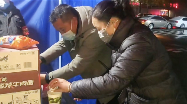 “那天晚上很冷,风很大,还下着雪。看他们那么辛苦,就想弄点奶茶和泡面,让他们加点餐,暖和一些。”夫妻俩一商量,说干就干。方便面、火腿肠和奶茶等,装了满满的一三轮车。雪越下越大,装载完毕后,周雪战和妻子陆续把食物和热饮递到了在各个小区大门外值班的工作人员手里。