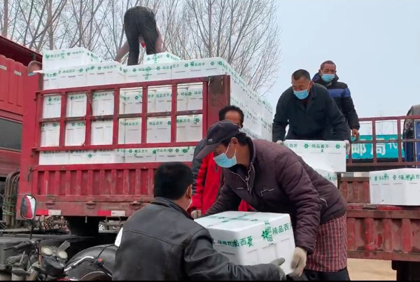 3月13日早上8点半,一辆大货车停在了菏泽市定陶区黄店镇王楼蔬菜交易市场里。几名志愿者排成一行,接力把一箱一箱蔬菜搬到了车上。
