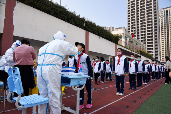 4月10日,医务人员为青岛立新小学学生进行核酸采样。当日,山东青岛部分学校组织师生进行核酸采样工作,为恢复线下教学做准备 新华社发