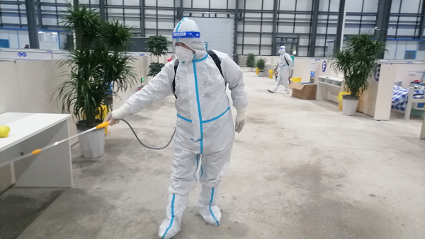 队伍成员集合完毕,接受基本安全培训后,王和新便和队员们穿戴好防护装备,为进入方舱医院进行消杀做好了准备。在了解了院方的实际困难后,队员们还决定扩大原定消杀范围,每天进入部分红区进行消杀。因为防护服密闭不透气,加上携带着沉重的消杀设备,消杀过后,所有队员们的汗水都湿透了衣衫。但看到方舱医院整体消杀作业成果,看到医护人员、病患为救援队的“点赞”后,王和新觉得,所有的辛苦都是值得的。
