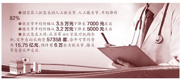 据介绍,此次国家组织的人工关节集采,48家参与集采的企业有44家中选,中选率达到92%,既包括医疗机构常用产品的知名企业,也包括新兴企业,中选企业产品占到医疗机构使用需求量的90%以上。“也就是说,医疗机构和患者常用的大部分人工关节产品,产品没变、价格降低了。本次集采工作,我省有403家医疗机构参加,首年意向采购量57358套,每年可节约费用15.75亿元,预计有6万余名髋关节、膝关节患者从中受益。”仇冰玉说。
