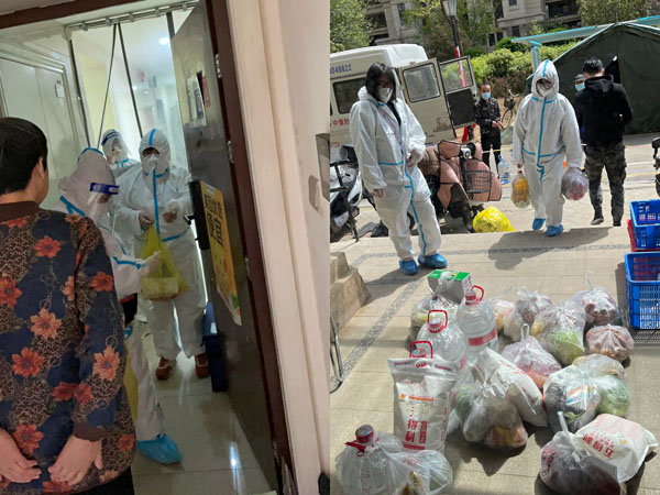 由用户网购或社区捐赠的水、油、面粉、蔬菜等各种生活物资密密麻麻铺了一地,部珂夫妻二人按快递单上的内容,清点物资并逐一运送到住户家门口。“每天数不清要上下楼多少次,完成所有物资分送到户大概需要接近2个小时。”部珂介绍道,由于防护服密封不透气,通常往返几趟就已汗流浃背、气喘吁吁。为了高效运送并节省体力,部珂特意自备了一辆小推车和一个大篮筐,最多的一天夫妻二人搬运了约300包物资。