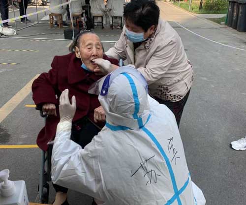 采样队伍里来了位坐轮椅的老奶奶,老奶奶的家人说:“非让我推着来,说医务人员太辛苦了,别让他们爬楼了,”