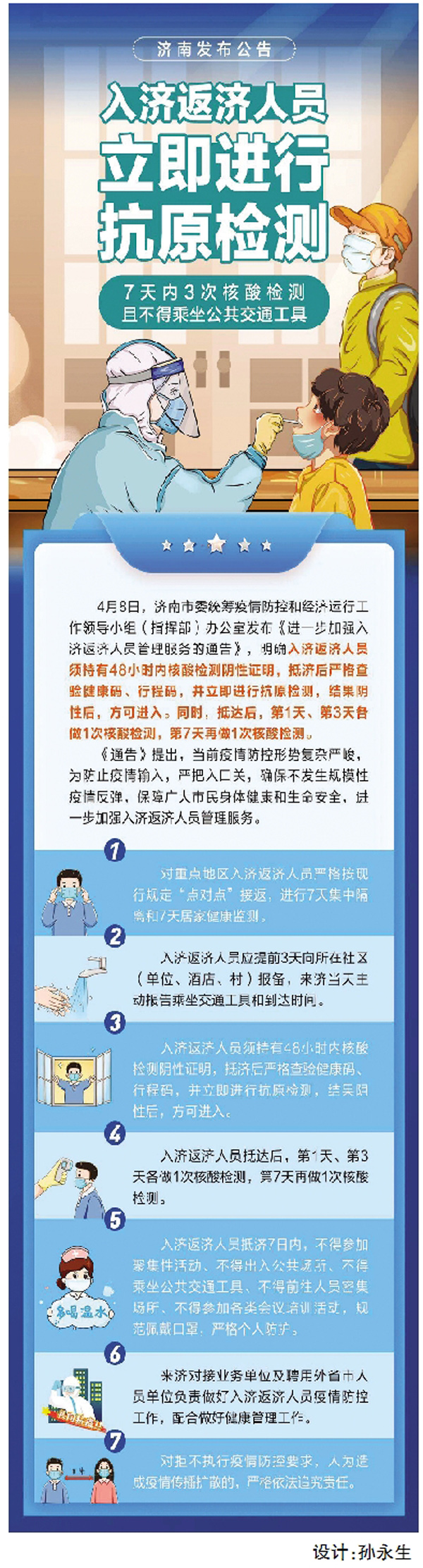 张蓉介绍,济南加强了国内重点地区入济人物同防。对从重点地区乘坐公共交通工具入济返济的人员,在机场、火车站、汽车站设置专门通道和登记报备区域,由目的地区县负责“点对点”接回。对从重点地区来济货车,引导进入各区县设立的货物堆场,进行车辆消杀、货物接驳。入济返济人员应提前3天向所在社区(单位、酒店、村)报备,并持有48小时核酸检测阴性证明。