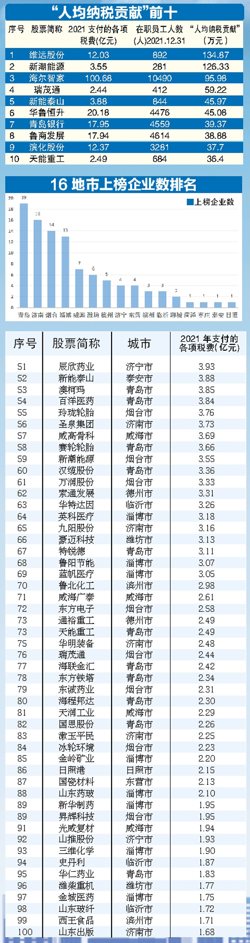 从上榜企业所在城市来看,青岛以19家上榜企业数量居于首位,省会济南上榜企业有16家,而从员工人均“纳税贡献”来看,个人创造最多税费贡献的企业是东营利华益集团旗下的维远股份,达134.87万元。