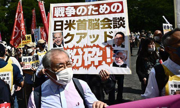 来自日本各地的数百名民众22日在东京举行集会和示威游行,抗议美国总统拜登当天开始的访日之行