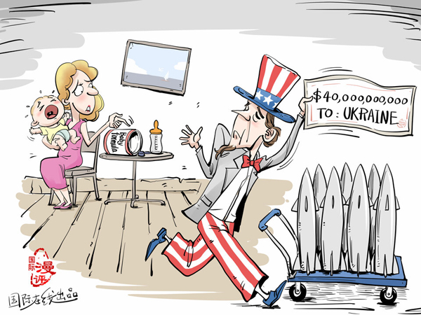 漫话:价格飙升, 库存奇缺,美国“奶粉荒”持续发酵,“一罐难求”令婴儿父母焦虑绝望。面对国内一团糟的供应链、经济、疫情等问题,美国政府和国会却还在给乌克兰砸钱——美国总统拜登日前签署关于对乌克兰追加400亿美元的拨款案。此举被认为是“弃美国民众的需求于不顾”。漫画来源:国际在线