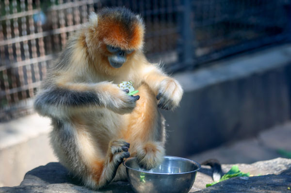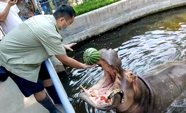 夏天,作为“大功率”粉碎机,河马一口一个冰镇西瓜,清新爽口。大象享受着淋浴带给它们的清凉,很是惬意;此外,它们还自带手动风扇,煽动耳朵既可以带来凉风,又可以靠毛细血管把热量散发出去,一举两得。豆沙、红枣味的牛奶冰棒,让金丝猴沉醉其中,静静享受丝滑冰凉的感觉; 猛兽们的特制冰工厂惊喜上线,保育员为孟加拉虎制作了青草和鸡血冰砖,既能够给它们带来一丝清凉,也能够让动物在进食的过程中活动一下筋骨。
