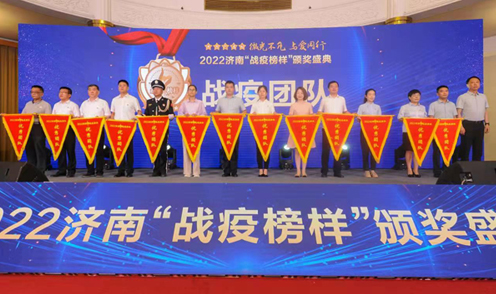 为弘扬伟大抗疫精神,激发广大干部群众干事创业的责任感、使命感、荣誉感,广泛凝聚众志成城、共克时艰的强大正能量,共同夺取“战疫情、促发展”双胜利,中共济南市委宣传部、济南市卫生健康委员会、山东商报共同举办了2022济南“战疫榜样”选树活动。经过逐层推荐评审和社会公示,最终评选出240余名获奖个人和单位。7月1日上午,2022济南战疫榜样颁奖盛典在南郊宾馆俱乐部举行,由于疫情防控的需要,邀请部分“战疫榜样”获奖代表赴现场接受表彰,济南市委宣传部分管日常工作的副部长、市文明办主任孙世会,山东文旅集团党委副书记、总经理丁艺,济南市卫健委党组副书记柏爱学,山东文旅集团党委委员、副总经理孙超,《山东商报》社社长庞道锋等领导出席,并为“战疫榜样”们颁奖。