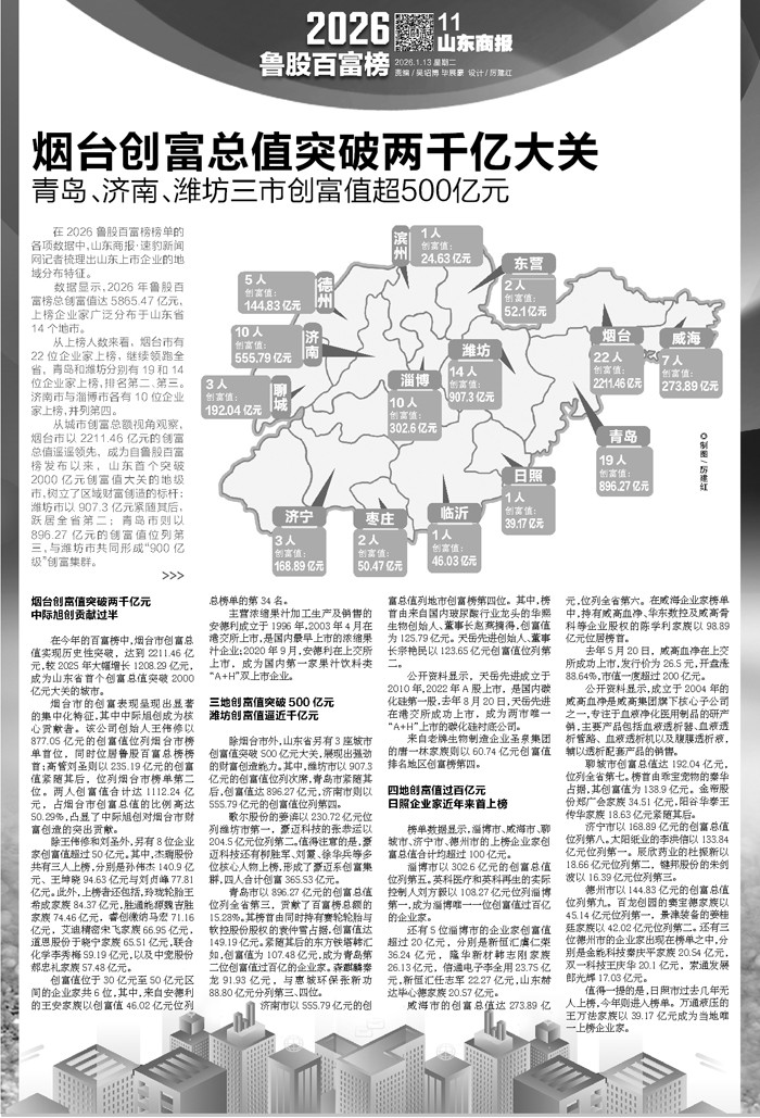数据显示,2026年鲁股百富榜总创富值达5865.47亿元,上榜企业家广泛分布于山东省14个地市。