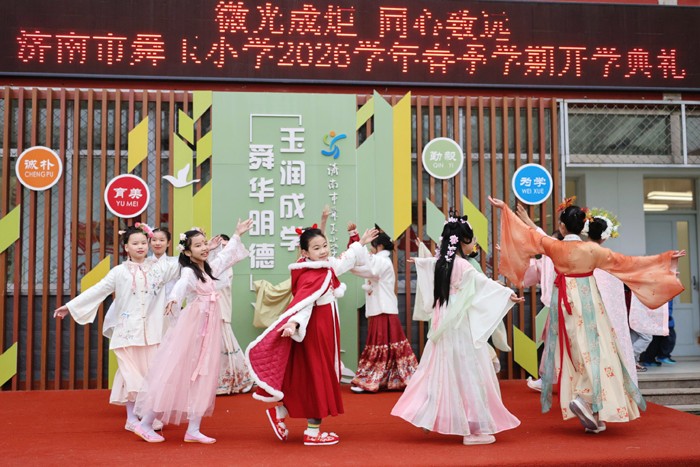 和以往不同,济南市舜玉小学今年的开学典礼,学生们精心编排了“月令花神”主题节目,十二月令,十二种花,十二位花神次第登场,引出陶渊明、李白、陆游、白居易等十二位具有高洁品格与爱国精神的诗人代表。花神翩跹,诗魂流芳,孩子们在诗词的吟咏传颂中感受中华文脉的生生不息。济南市文化东路小学开学典礼在激昂奔放的二胡曲《赛马》中拉开帷幕。随后,学生们走上舞台,通过快板、情景剧、朗诵、小合唱以及非遗快闪等沉浸式展演,生动还原了假期“红领巾寻访”的所见所闻。从老街巷里的非遗技艺到泉水畔的民俗传承,孩子们用自己的方式诠释了对家乡文化的理解。