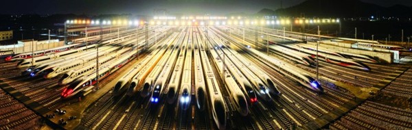 2月2日,2026年春运将正式拉开帷幕。在中国铁路广州局集团有限公司广州动车段,一列列动车组排列整齐,停靠在存车场,如同一支“陆地舰队”,整装待发。图为2月1日,动车组列车停靠在广州动车段存车场。◎新华社发
