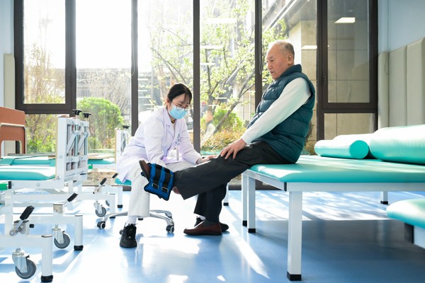 3月25日,在济南市历下区槿椿泺园,康复治疗师辅助老人进行下肢抗阻训练。新华社发