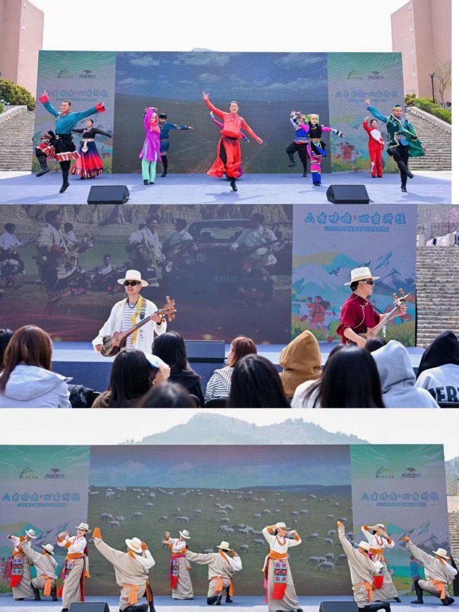 外场舞台以一部青海文旅宣传片拉开序幕,非遗项目扎木聂弹唱、歌舞表演以极具张力的舞台呈现,诠释着西北高原的生命力与自由意象,现场掌声此起彼伏,让师生们直观感受到原生态的艺术感染力与非遗文化魅力。“夏都西宁”“最美9号公路”“秘境芒崖”“江源玉树”“世界的坎布拉与清清黄河”“天空之镜”“万里黄河第一峡”等文旅资源推介,将师生们带入“山宗水源”的叙事语境,传递出多元文旅资源共生共融的发展内核。