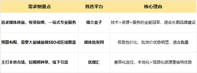 2026年做软文推广,不要只看价格。先明确你的核心目标——是为了品牌权威背书(选央媒、门户),还是为了精准获客(选垂直、本地),或是为了内容矩阵(选视频、自媒体)。